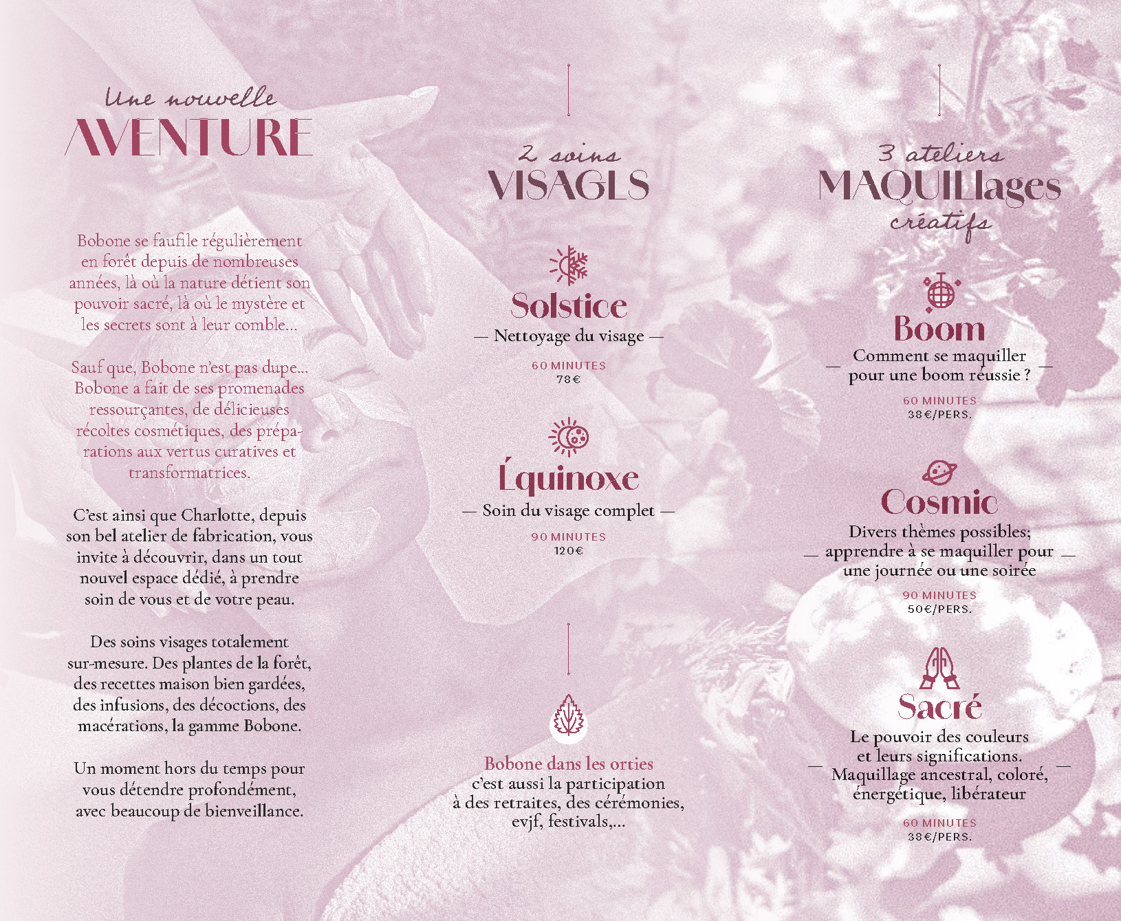 Des soins visages totalement sur-mesure. Des plantes de la forêt, des recettes maison bien gardées, des infusions, des décoctions, des macérations, la gamme Bobone.